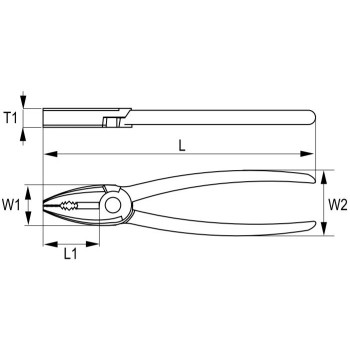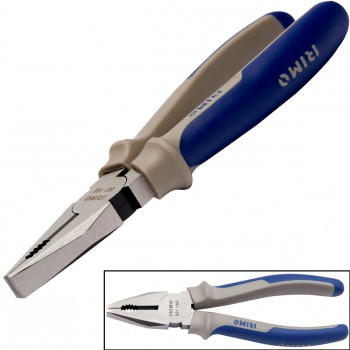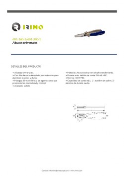 Alicates universales. Con filo de corte templado por inducción para alambres blandos y duros. Mangos: bi-materiales y de agarre suave que proporcionan comodidad y control. Acabado: pulido. Material: Aleación de acero de alto rendimiento. Dureza máx. del filo de corte: 58-65 HRC. Norma: ISO 5746.