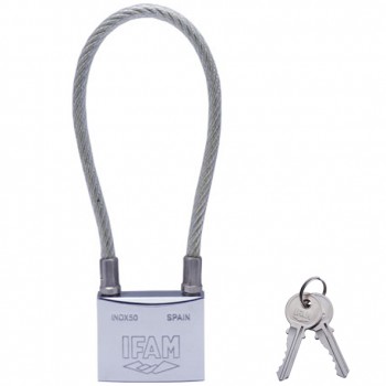 El candado Inox Cable de IFAM combina el cuerpo de un candado Inox50 con un cable de acero flexible que lo convierte en un producto ideal para asegurar varios elementos a la intemperie situados a una cierta distancia. Pongamos, por ejemplo, el mobiliario de la terraza de un bar, un casco de motorista al sillín de la moto, puertas de contenedores de transporte…