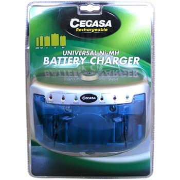 Cargador universal para acumuladores de Ni-MH. Diseñado para cargar de 2 a 4 acumuladores AAA (HR03) ó de 2 a 4 acumuladores AA (HR6) ó de 2 a 4 acumuladores C (HR14) ó de 2 a 4 acumuladores D (HR20) ó de 1 a 2 acumuladores 9V (HF22). Sistema de protección de la vida útil del acumulador por detección de -DV y timer para los tamaños AA, AAA, C y D. Selección automática de corriente de carga para los diferentes tamaños de acumulador. Indicadores LED para estado de carga.