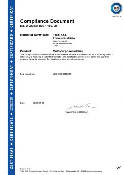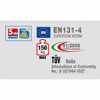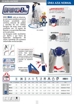 Escalera BRIKOBLU universal Europea, toda en aluminio, concebida como extrema solución de solidez y sencillez de uso. Sólidas bisagras de acero unen cada montante con 18 puntos de fijación y no permiten flexiones en la estructura.