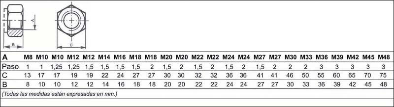 Tuerca din-934 hexagonal, de acero y rosca métrica.
